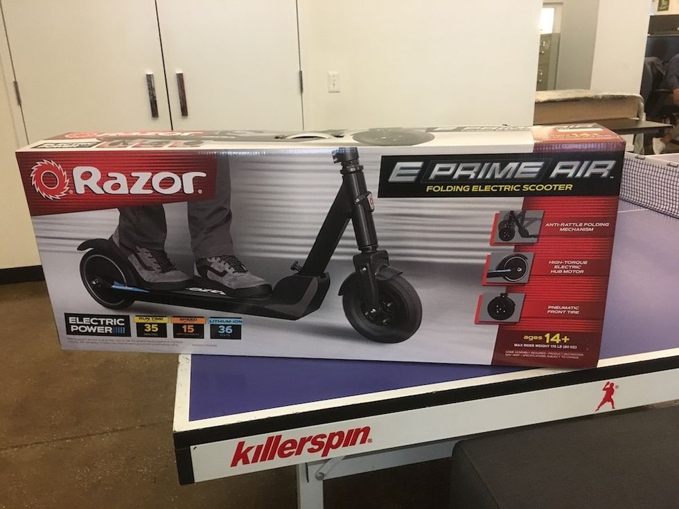 Razor E Prime Air Folding Premium Electric Scooter •. Light up the Ride The E Prime III Electric Scooter features a LED headlight, a brake-activated taillight, and reflective decals for better visibility. The Razor E Prime Air premium electric scooter has it all! Sporting the sophisticated design and electric efficiency of the original E Prime, the E Prime Air features a large, 8" (200 mm), pneumatic front tire that softens out rough surfaces and a sturdy aluminum frame for the smoothest ride around